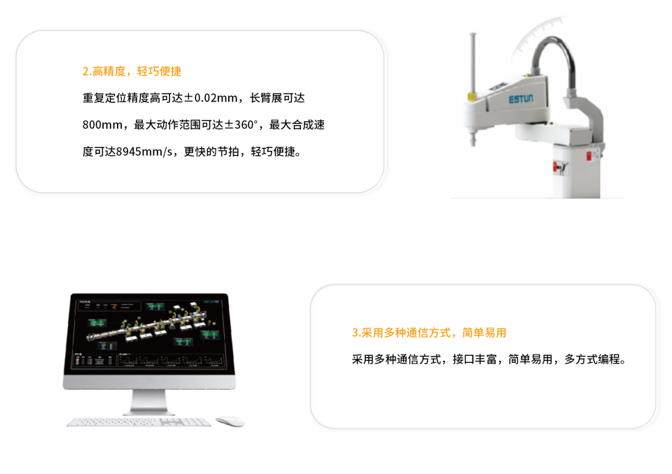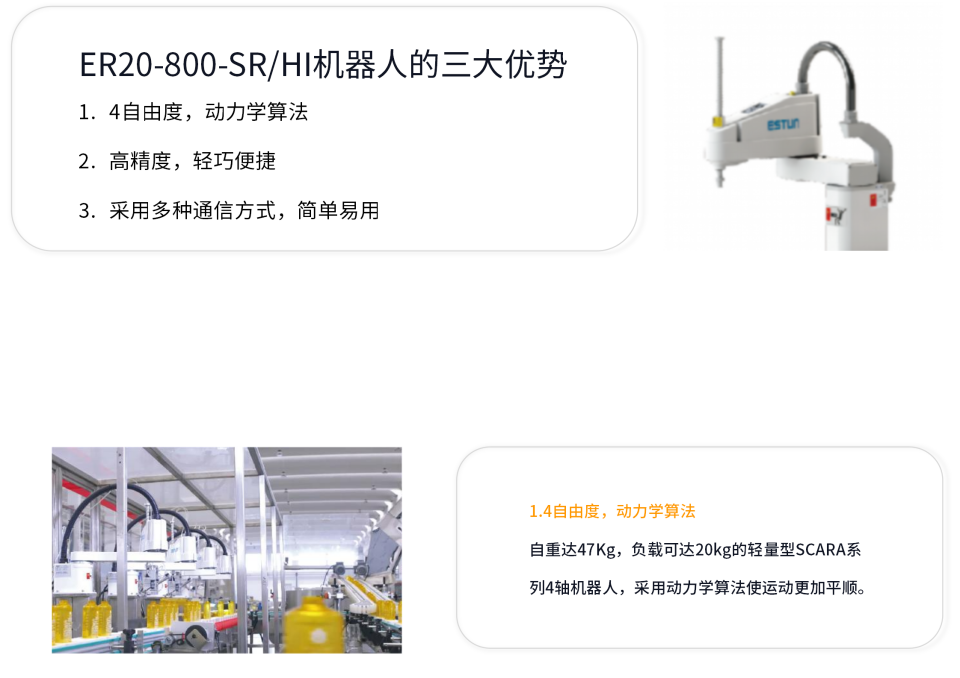 埃斯顿SCARA机器人主打高效、高精、易用, 已在3C、锂电、包装、光伏等行业得到广泛应用。全系列产品采用埃斯顿专用伺服系统、搭配埃斯顿全新一代的动力学算法使其运动更加平顺、速度更快、精度更高。其支持虚拟与实体示教器、ESTUN Editor编程软件等多样化的编程方式,使用更加灵活多变。