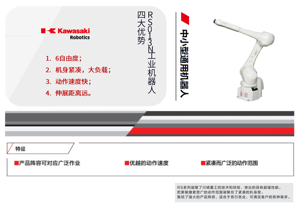高速、高性能的行业机器人 R系列机器人为所有小中型工业机器人设定了基准。紧凑的设计和杰出的速度、伸展距离和工作范围使R系列机器人适用于遍及众多不同行业的广泛应用范围。应用于装配, 搬运, 上下料, 涂胶, 抛光、去毛刺。
