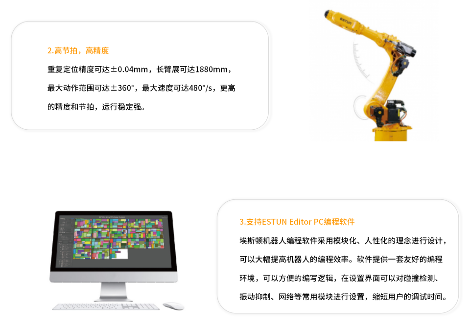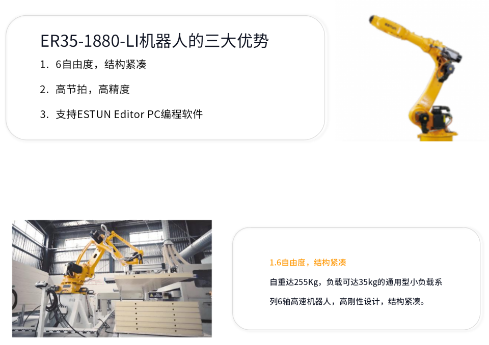 埃斯顿小负载系列产品广泛应用于光伏排版,锂电大面清洗,PCB板上下料,汽车零部件搬运、压铸取件/喷涂及打磨等领域。此系列机型具有结构紧凑、精度高、节拍快等特点。并支持Estun editor PC编程软件,调试更便捷。