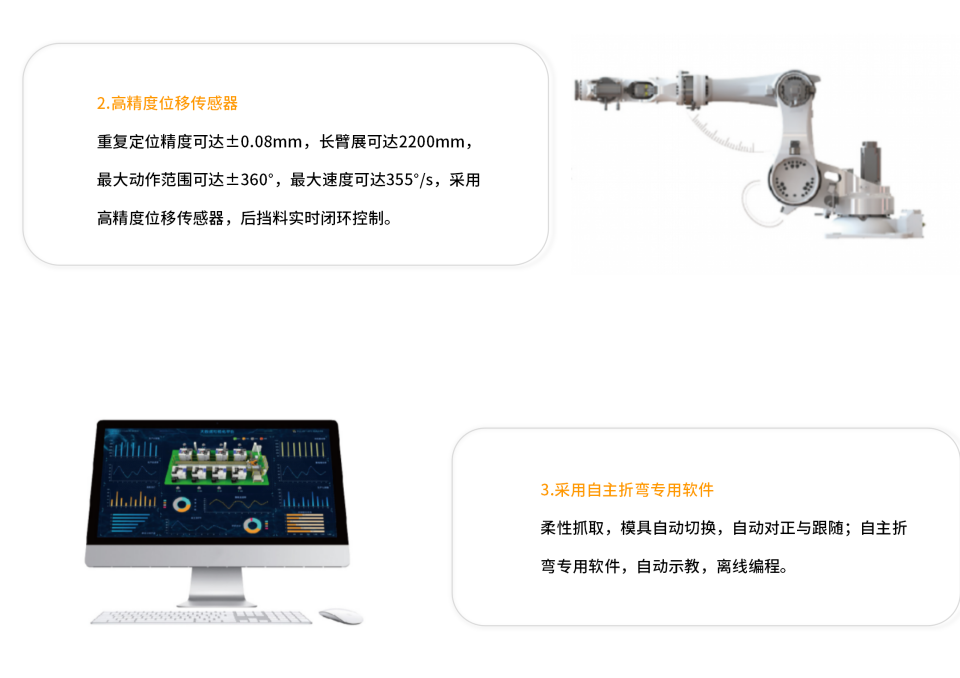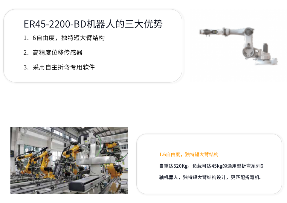 埃斯顿集二十多年钣金加工行业经验,自主设计了独特的折弯机器人,与众不同的本体设计,独特的短大臂结构,使得机器人可以获得更合理的姿态,更利于折弯工艺,无须垫高折弯机或者挖坑下沉机器人,便于人工操作,且对安装场地无特殊要求,是折弯机首选的高速机器人自动化折弯解决方案。