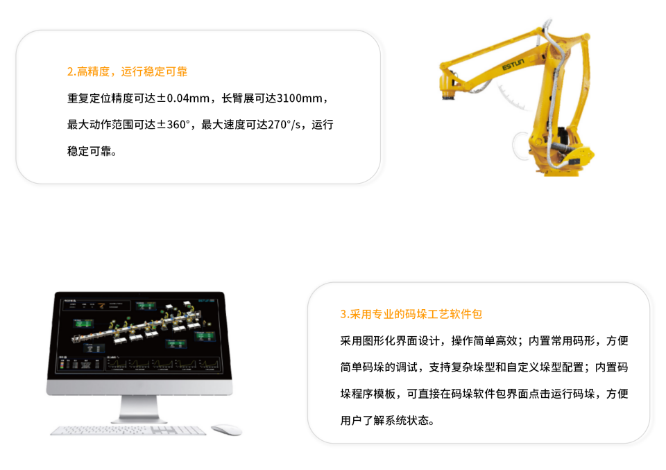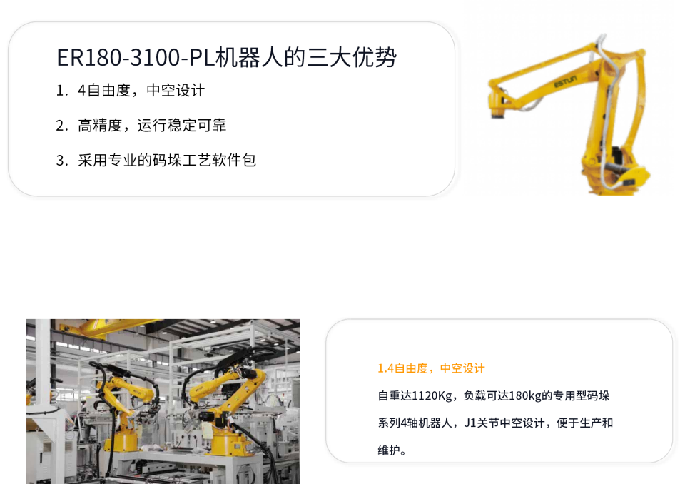 埃斯顿码垛系列工业机器人是行业内具有独特结构的专用高速码垛机器人,与传统码垛机器人相比,全新本体结构设计,独特的单副杆和更先进的氮气缸结构,具有更小的宽度和重量,本体更为紧凑,占地小,更轻质化,有效降低使用能耗,提升速度,是只能包装码垛行业首选的高速码垛解决方案。。