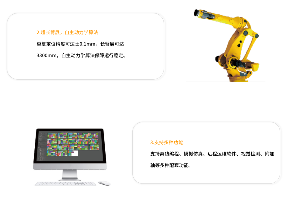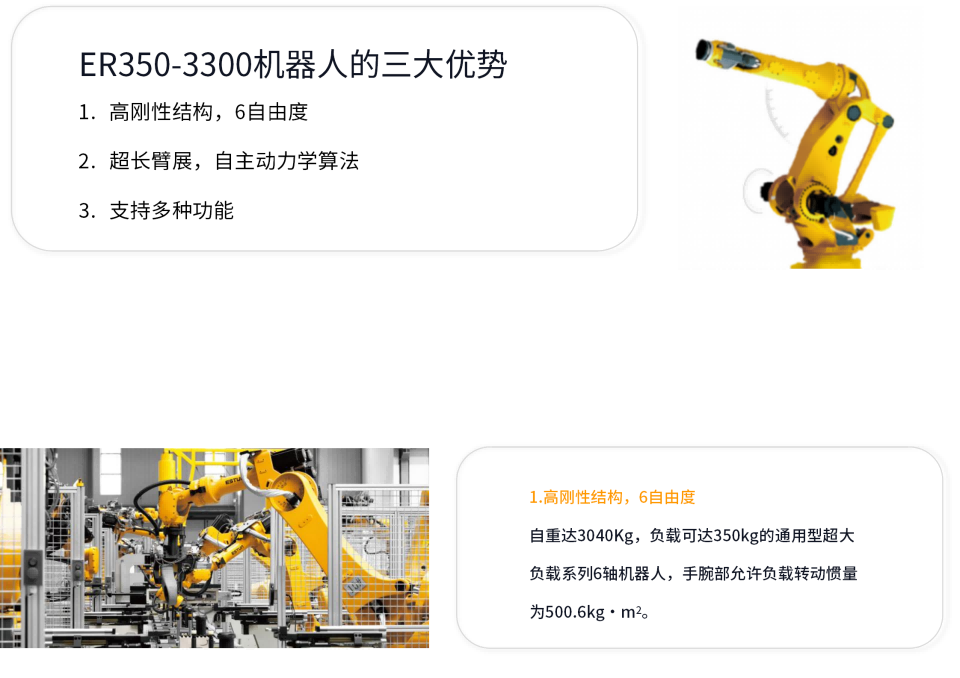 ER350-3300是通用型超大负载系列产品广泛用于建材家居、陶瓷、锂电、光伏、汽车零部件等行业的物料搬运应用。具备超大负载能力和超长的动作范围。支持离线编程、模拟仿真、远程运维软件、视觉检测、附加轴等多种配套功能。