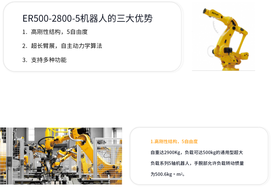 ER500-2800-5是通用型超大负载系列产品广泛用于建材家居、陶瓷、锂电、光伏、汽车零部件等行业的物料搬运应用。具备超大负载能力和超长的动作范围。支持离线编程、模拟仿真、远程运维软件、视觉检测、附加轴等多种配套功能。