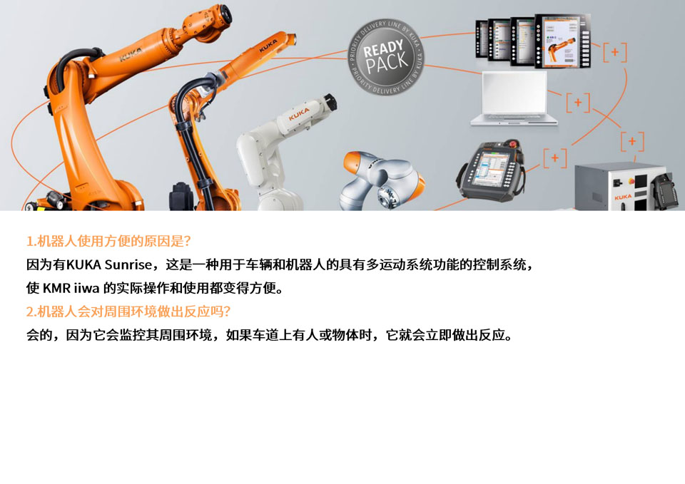 KMR iiwa 自主型机器人灵活,可以实现人机合作。它将 LBR iiwa 灵敏轻型机器人和自主移动式平台的优点综合在一个系统中。KMR iiwa 不受地点限制、高度灵活——为满足工业 4.0 的要求创造了理想条件。