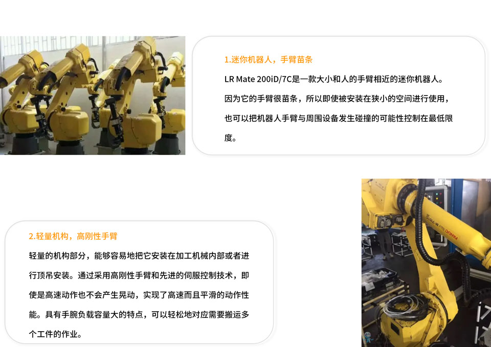 LR Mate 200iD/7C是一款大小和人的手臂相近的迷你机器人,可达半径717mm,手腕可搬运质量为7kg,通过采用高刚性手臂和先进的伺服控制技术,即使是高速动作也不会产生晃动,实现了高速而且平滑的动作性能。