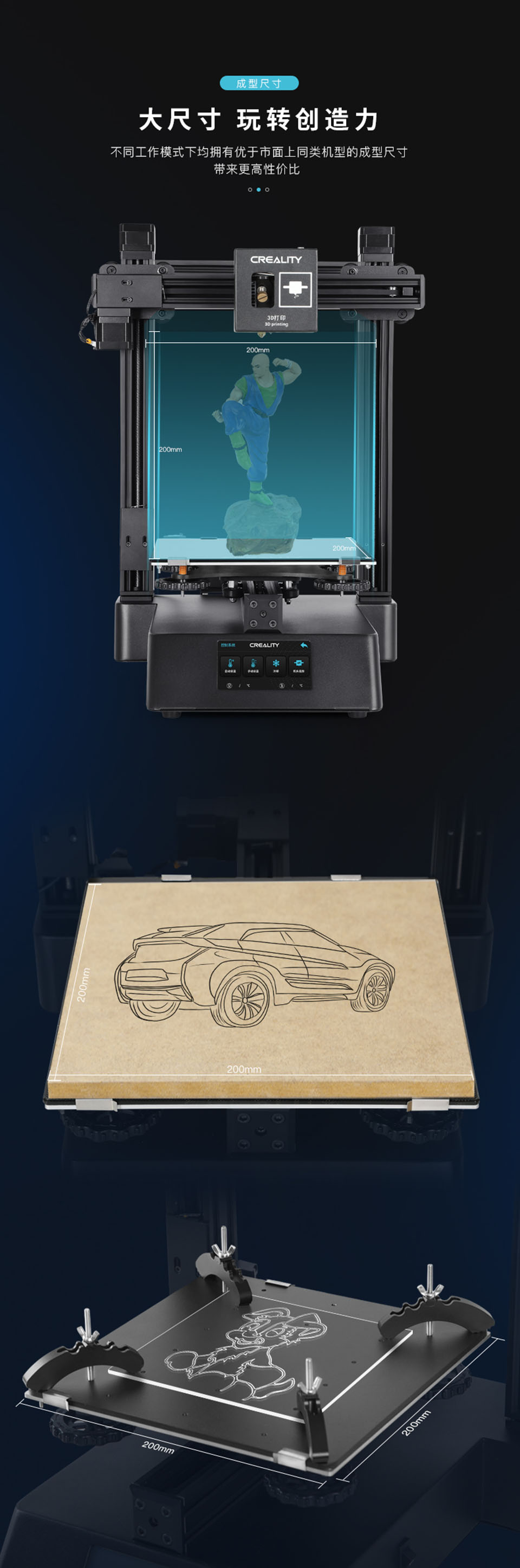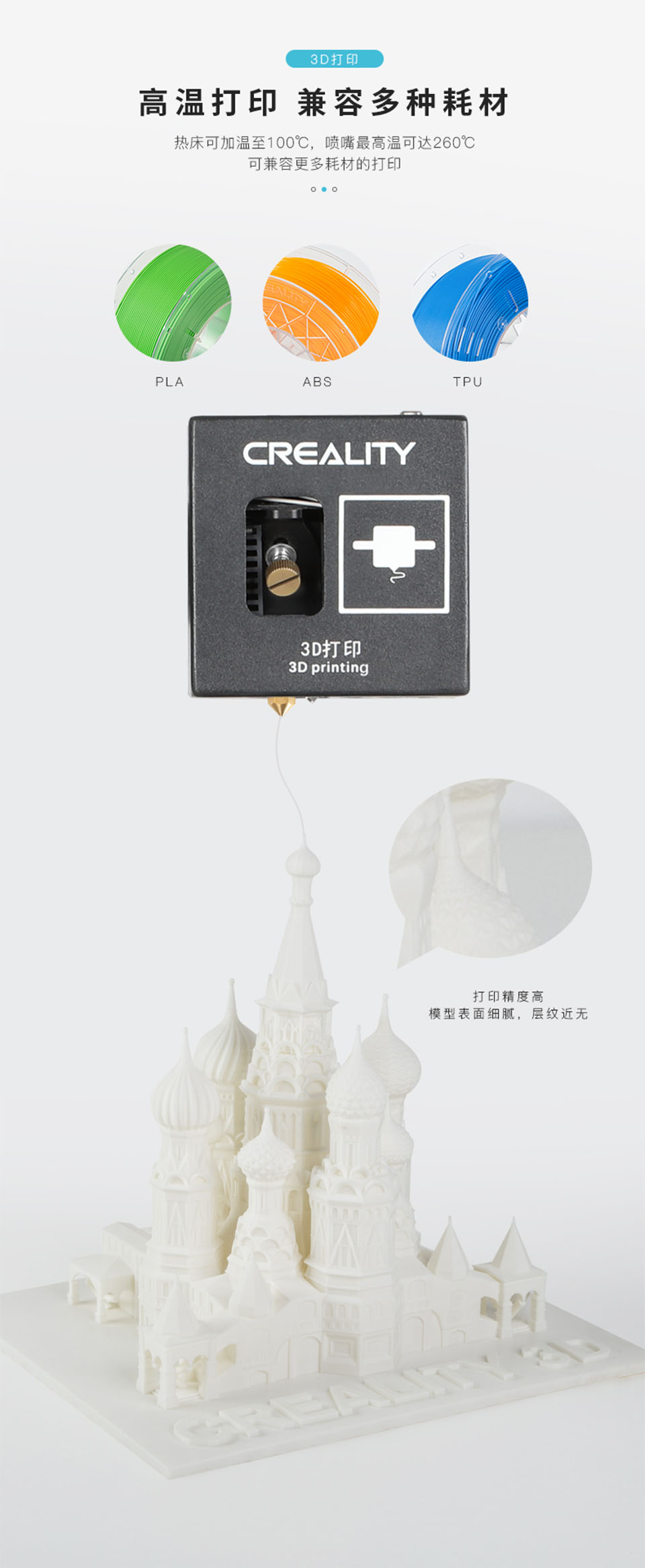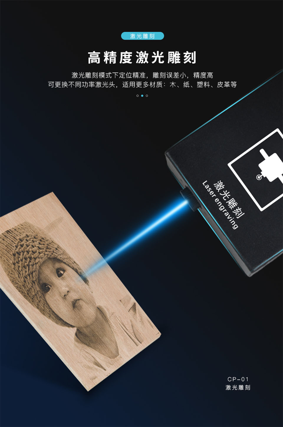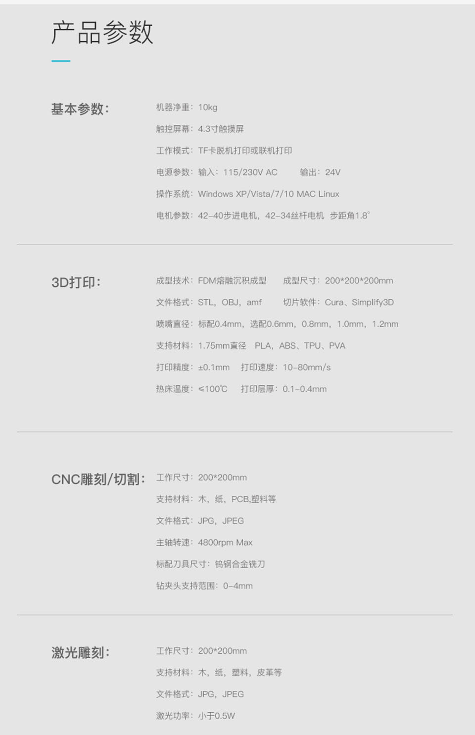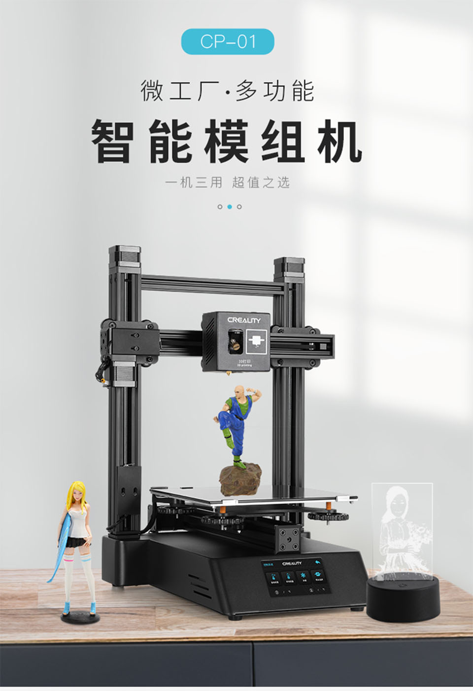CP-01是一款集3D打印、激光雕刻、CNC切割于一体的多功能模组机。热床可加温至100℃,喷嘴最高温度可达260℃,可兼容更多耗材的打印。