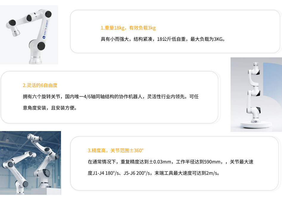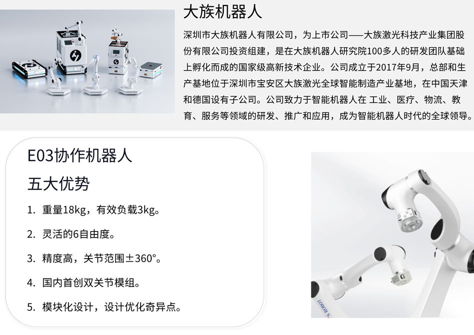 BFT机器人一站式机器人工业互联网平台提供的大族E03机器人有效负载为3kg,工作半径为590mm,重复定位精度为±0.03mm,关节范围±360°,支持TCP/IP and Modbus通讯方式。可应用于自动化集成生产线、装配、拾取、焊接、研磨、 喷漆等领域。