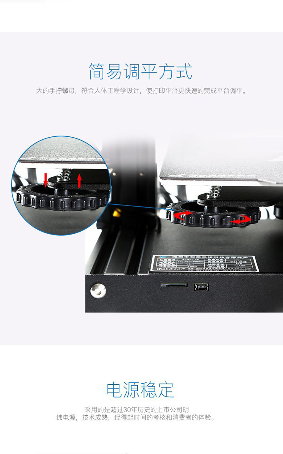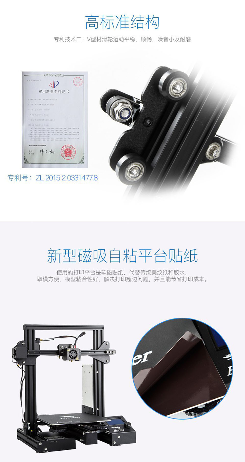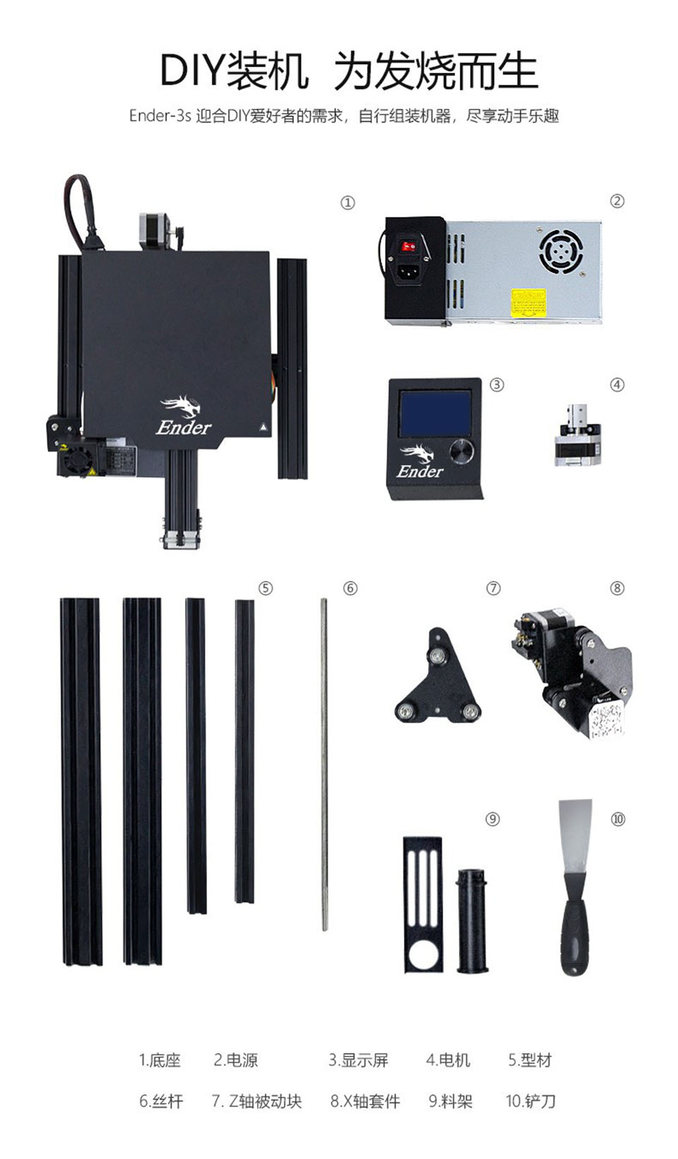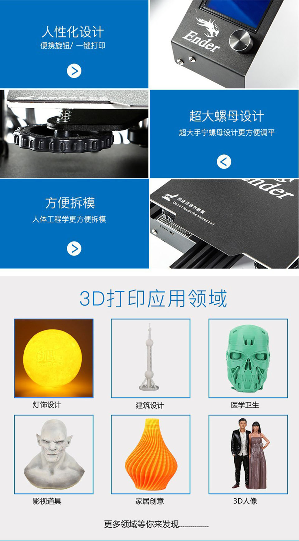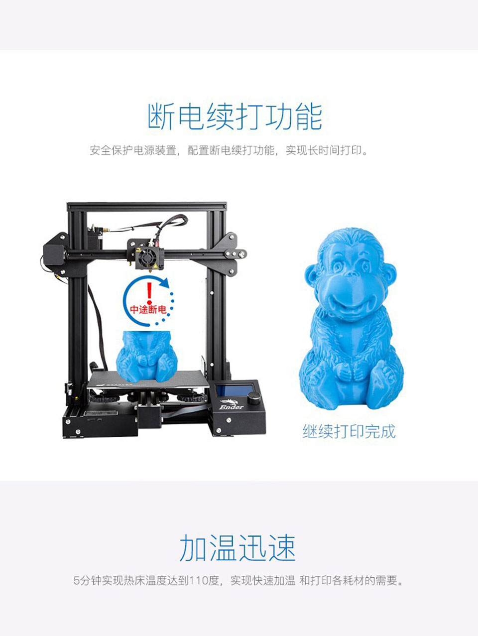 Ender-3S采用一体式结构,超大打印尺寸,满足更多打印需求;新型磁吸自粘平台贴纸;安全保护断电装置,配置断电续打功能,实现长时间打印;5分钟实现热床温度达到110度,实现快速加温和打印各耗材的需要。