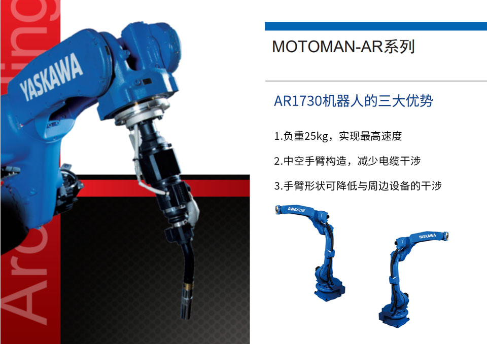 AR1730机器人采用中空手臂构造,可以选择焊枪线缆内部布线或外部布线,减少电缆干涉导致的动作限制、排除断线、使示教简易化,可以客人的工作和设备进行适合的装备。