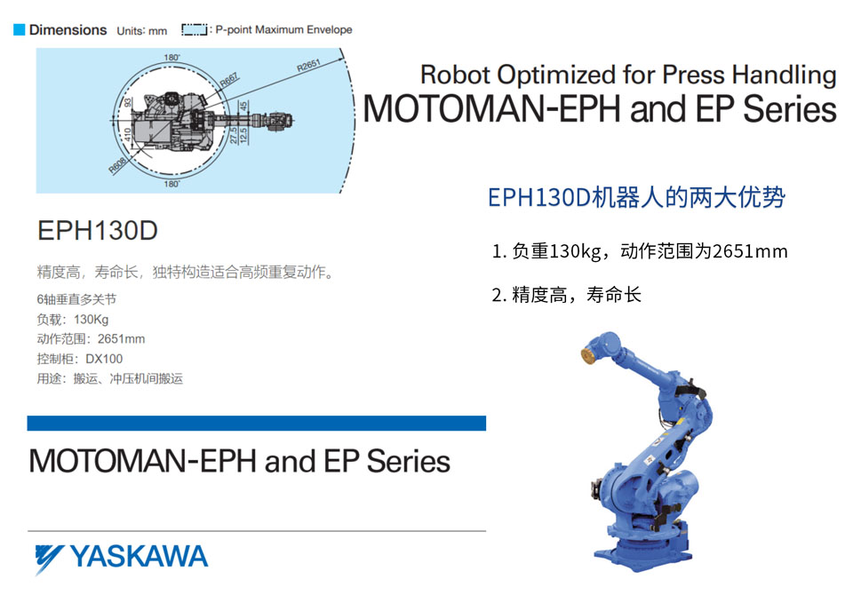 EPH130D机器人可搬重量130kg,动作范围为2651mm,独特长上臂设计,适合重复取件动作;精度高,寿命长;全轴低功率输出,无需设置安全栅栏,设备构成简易。