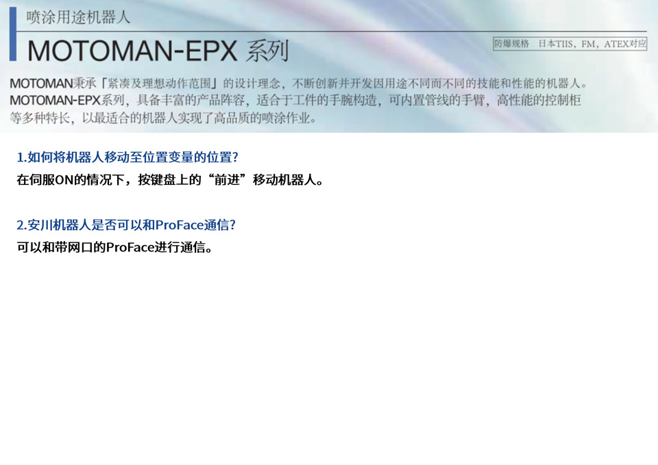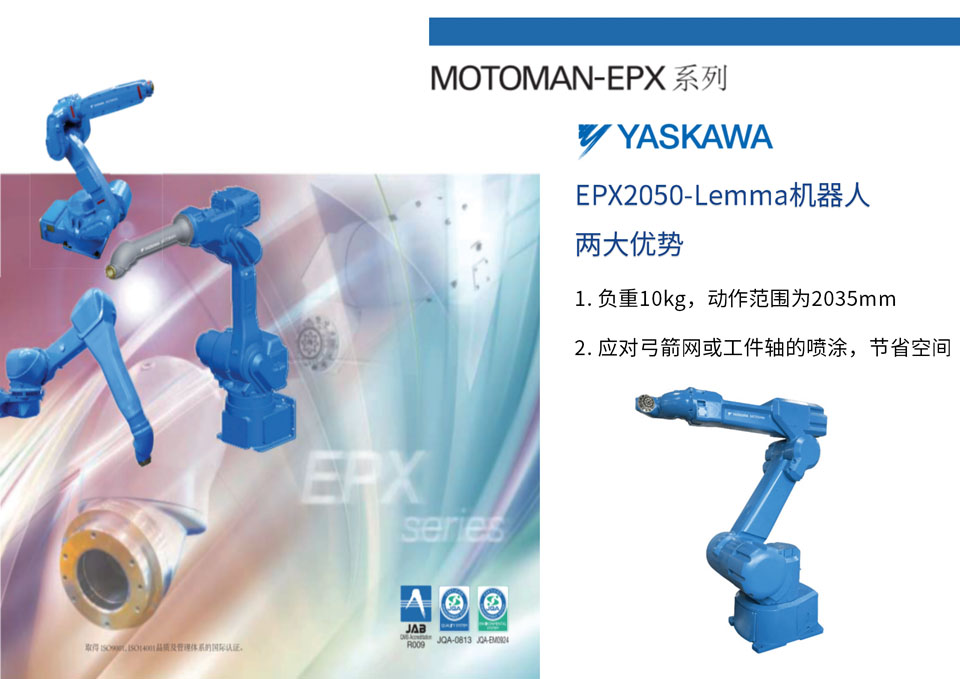EPX2050-Lemma机器人合适前面、平面传送带同步跟踪的喷涂方式。通过与MOTOFEEDER配套使用,可应对弓箭网或工件轴的喷涂作业;通过配置小型控制柜,节省了空间。