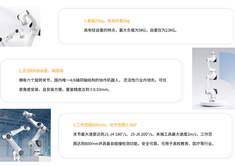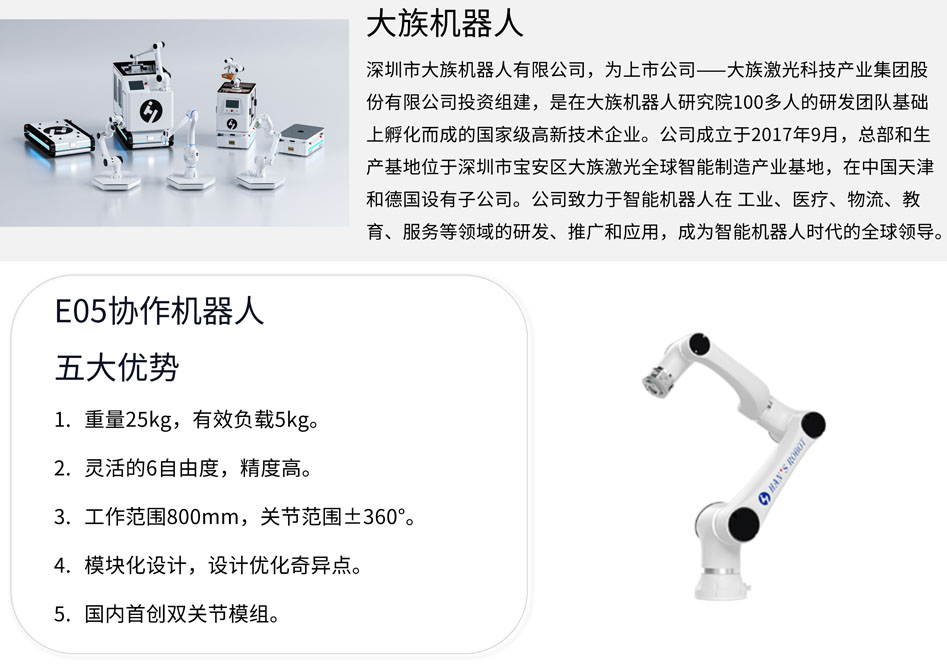 BFT机器人一站式机器人工业互联网平台提供的大族E05机器人有效负载为5kg,工作半径为800mm,重复定位精度为±0.03mm,关节范围为±360°,支持TCP/IP and Modbus通讯方式。