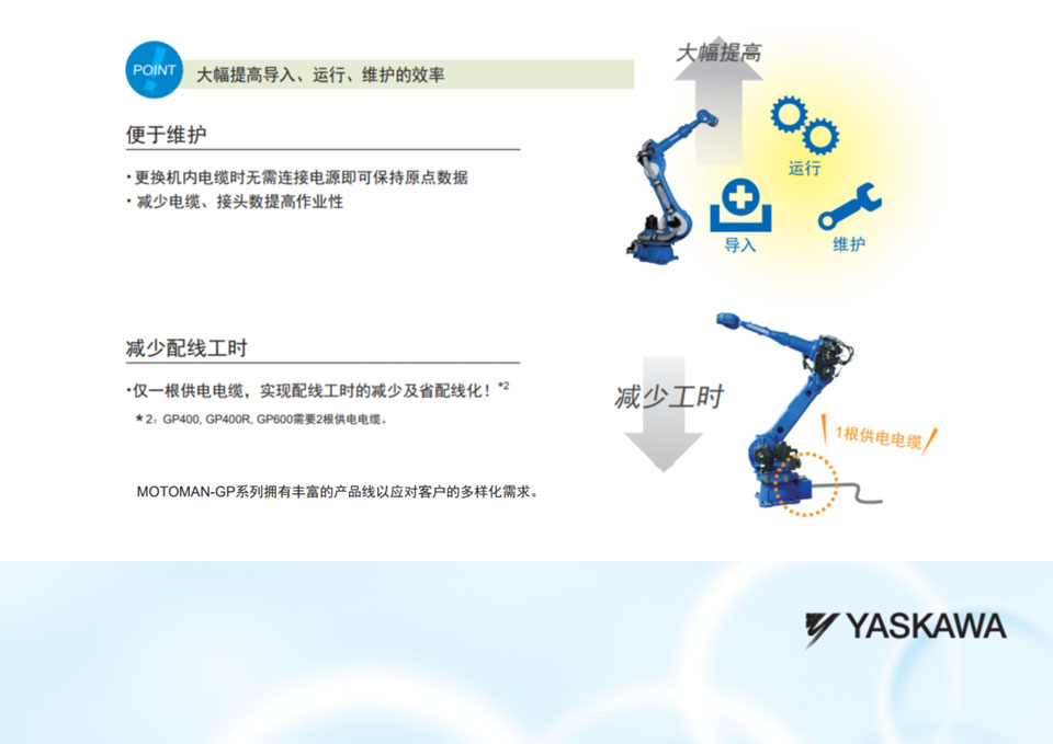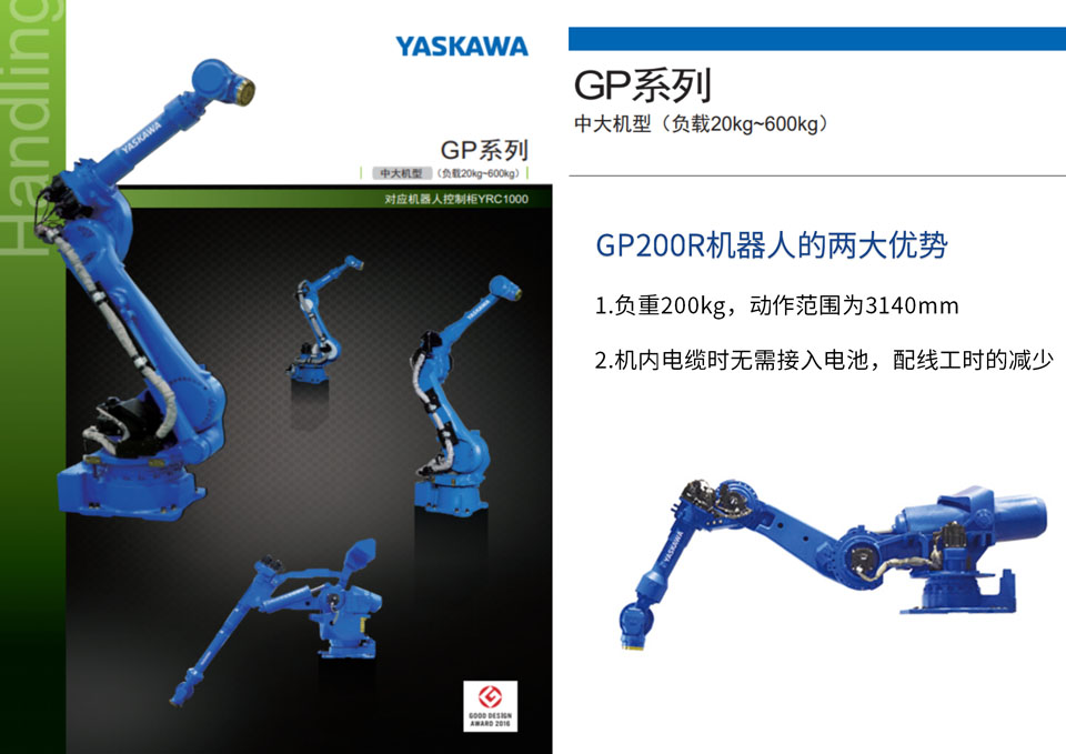 GP200R机器人可搬重量200kg,动作范围为3140mm,通过和其他机器人提升的组合实现多彩的线路布局,架子置可以有效地利用空间。