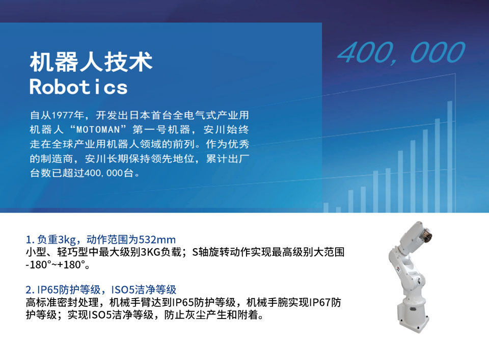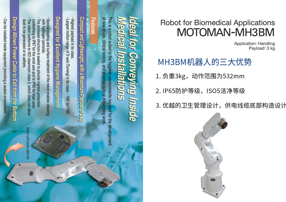 MH3BM机器人高标准密封处理,机械手臂达到IP65防护等级,机械手腕实现IP67防护等级;实现ISO5洁净等级,防止灰尘产生和附着。