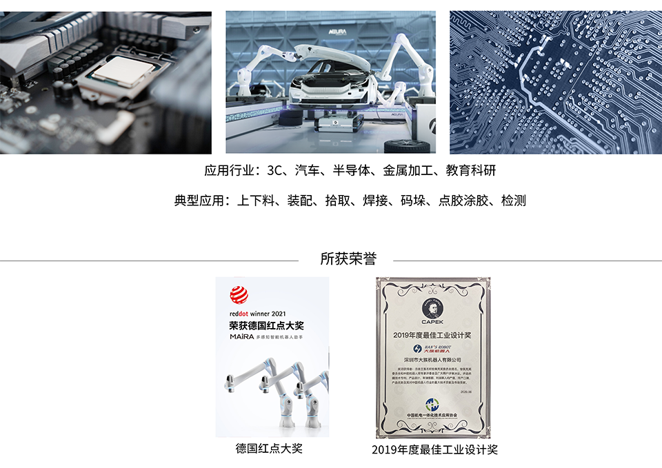 BFT机器人一站式机器人工业互联网平台提供的大族E05-L机器人有效负载为3.5kg,工作半径为950mm,重复定位精度为±0.03mm,关节范围为±360°,支持TCP/IP and Modbus通讯方式。Elfin系列6轴协作机器人,可应用于自动化集成生产线、装配、拾取、焊接、研磨、 喷漆等领域。