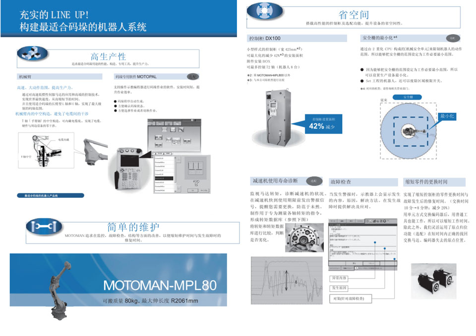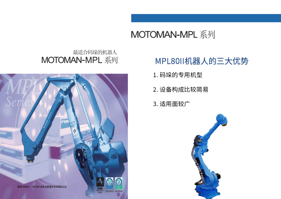 MPL80Ⅱ机器人码垛的专用机型,高速稳定,并且可以配合专用的码垛软件进行使用;全轴低功率输出,无需设置安全栅栏,设备构成比较简易,具有一定的稳定性。