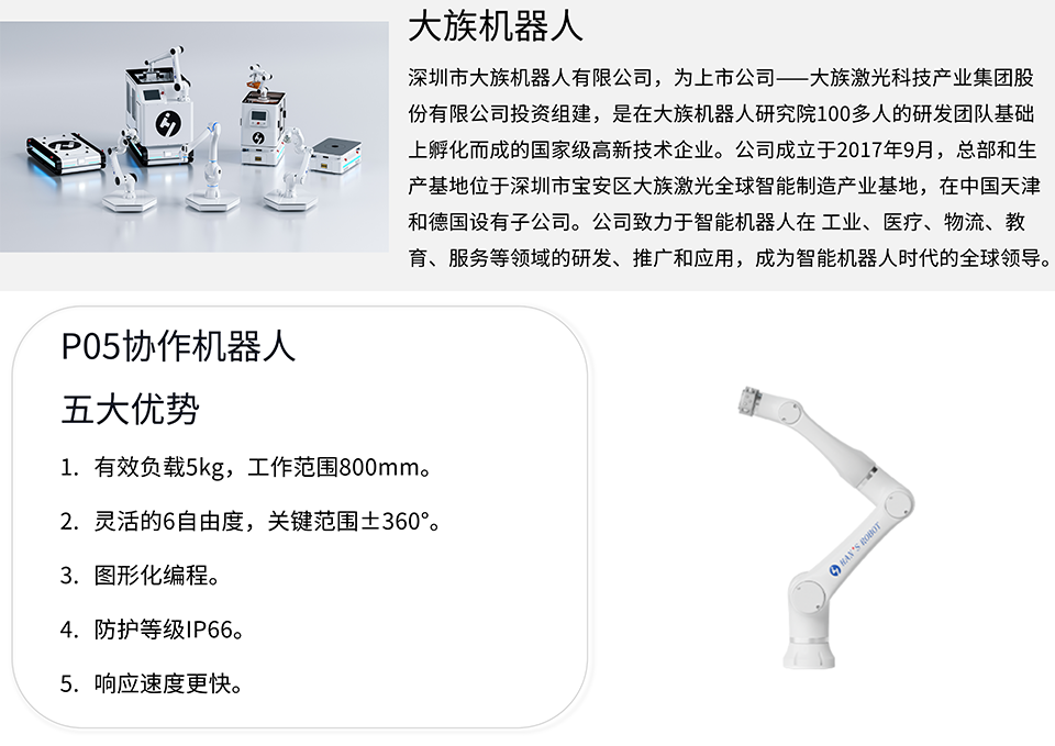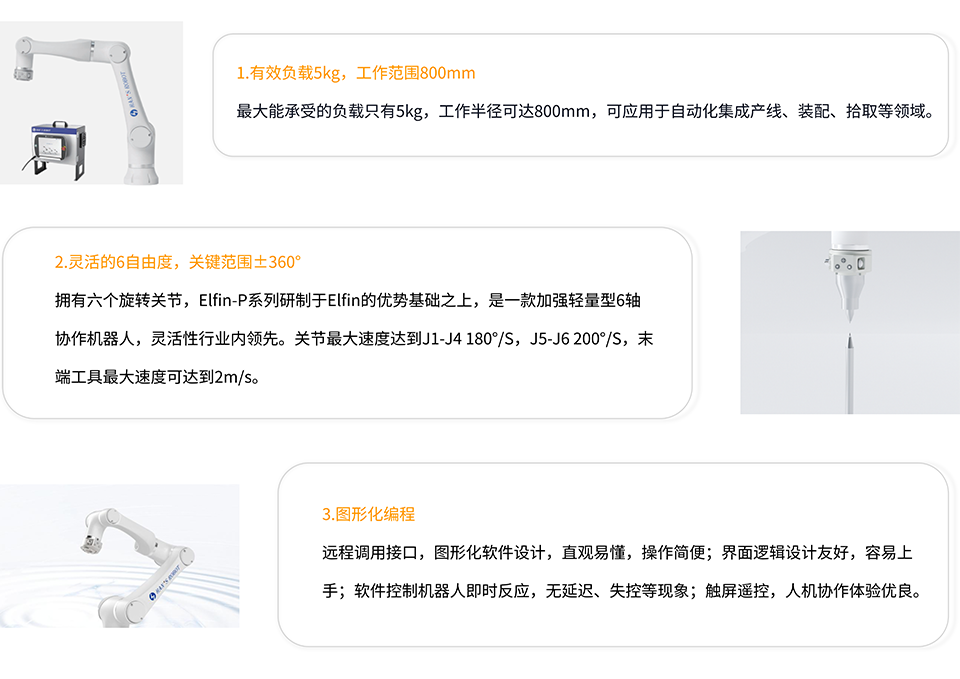 BFT机器人一站式机器人工业互联网平台提供的大族P05机器人工作半径为800mm,有效负载5kg,重复定位精度为±0.03mm。Elfin-P系列研制于Elfin的优势基础之上,是一款加强轻量型6轴协作机 器人,可应用于自动化集成生产线、装配、拾取、焊接、研磨、喷漆、点胶、 检测等领域。