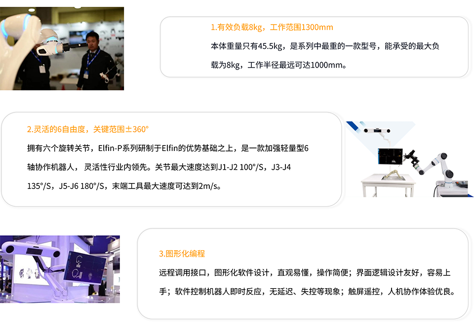 BFT机器人一站式机器人工业互联网平台提供的大族P10-L机器人有效负载为8kg,工作半径为1300mm,重复定位精度为±0.05mm,支持图形化编程,远程调用接口,支持TCP/IP and Modbus通讯方式。Elfin-P系列研制于Elfin的优势基础之上,是一款加强轻量型6轴协作机 器人,可应用于自动化集成生产线、装配、拾取、焊接、研磨、喷漆、点胶、 检测等领域。