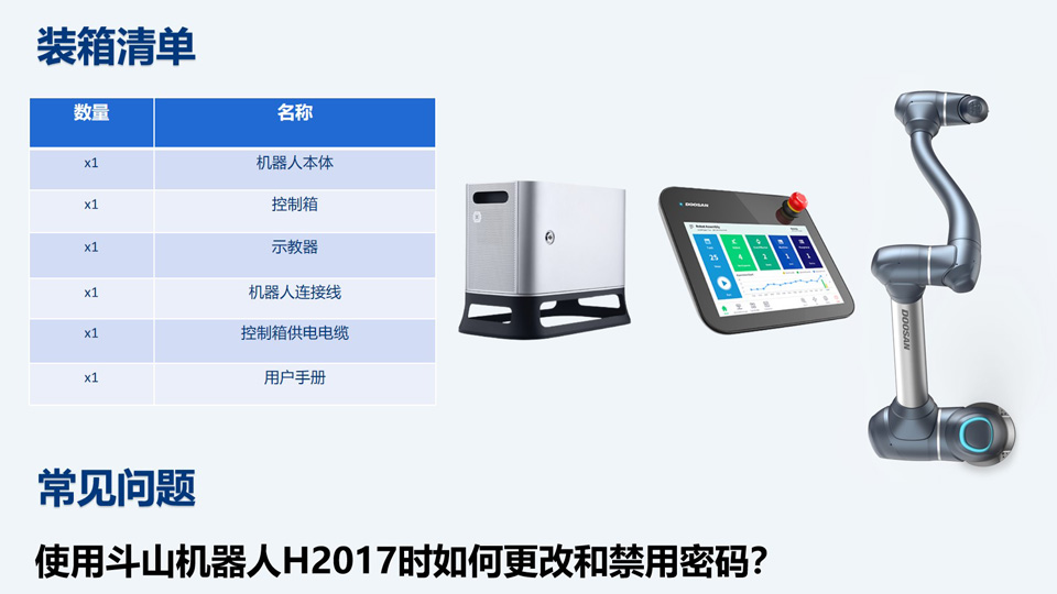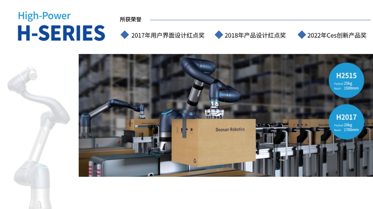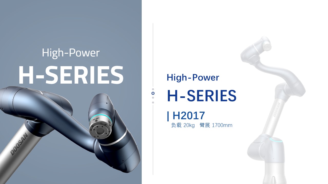 BFT机器人一站式机器人工业互联网平台提供的斗山H2017协作机器人的有效载荷为20kg,可达范围为1700mm,重复精度为0.1mm,重量仅为同类6轴多关节机器人的1/2,易于重新定位, 适合与AGV、AMR结合,可配置多种应用程序。