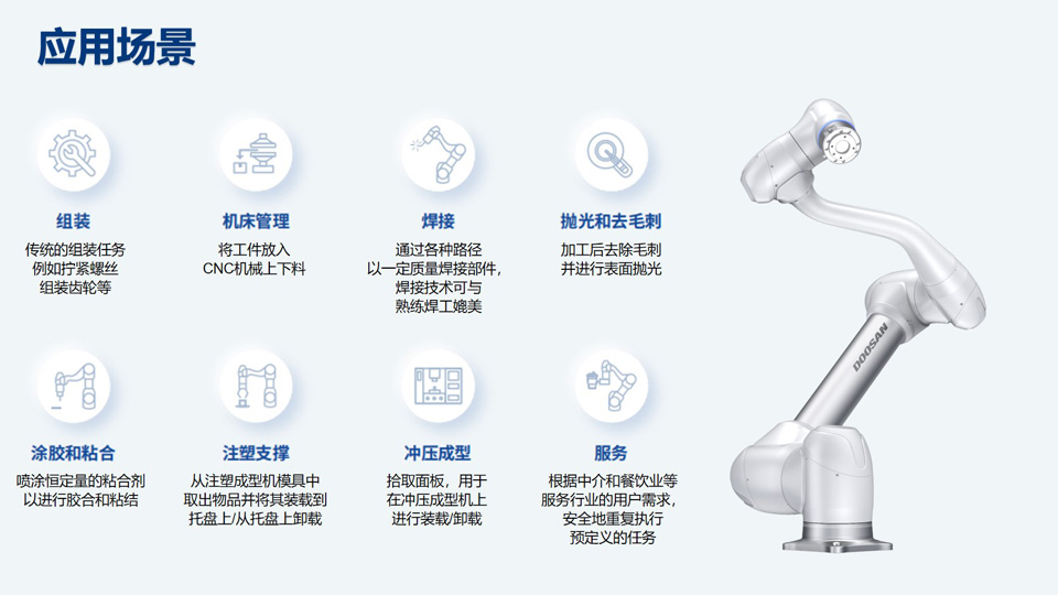 随着我国工业化的快速发展和全球经济的增长,而塑料和橡胶是重要的工业原料,在各个行业中得到广发的应用。传统的塑料和橡胶生产方式通常依赖大量人力劳动,但是人力作业是不稳定的,受人为因素的影响较大,并存在着生产效率低下等生产痛点。因此要引入智能化、自动化的生产设备,升级生产线。而斗山M1509机械臂在塑料和橡胶生产行业中能提供自动化、精确性、灵活性、安全性和可靠性等多重优势,帮助企业提高生产效率、质量控制和成本管理。