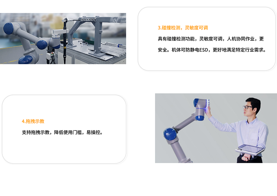 BFT机器人一站式机器人工业互联网平台提供的新松GCR3-620机器人的额定负载3公斤,工作半径620毫米,灵活小巧,轻便易用,支持拖拽示教,具有碰撞检测功能,适合于精密装配、医疗服务等应用场景。
