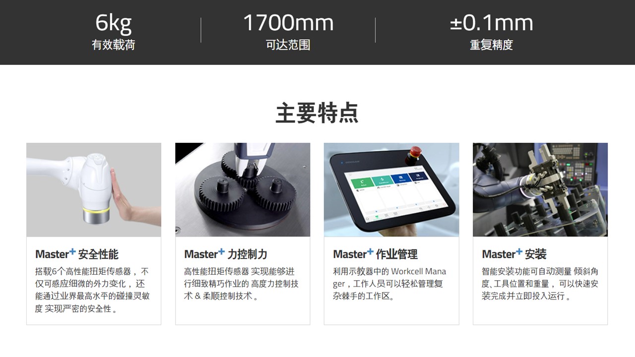 BFT机器人一站式机器人工业互联网平台提供的斗山M0617协作机器人的有效载荷为6kg,可达范围为1700mm,重复精度为0.1mm,利用示教器中的 Workcell Manager,工作人员可以轻松管理复杂棘手的工作区。