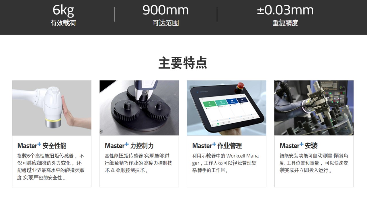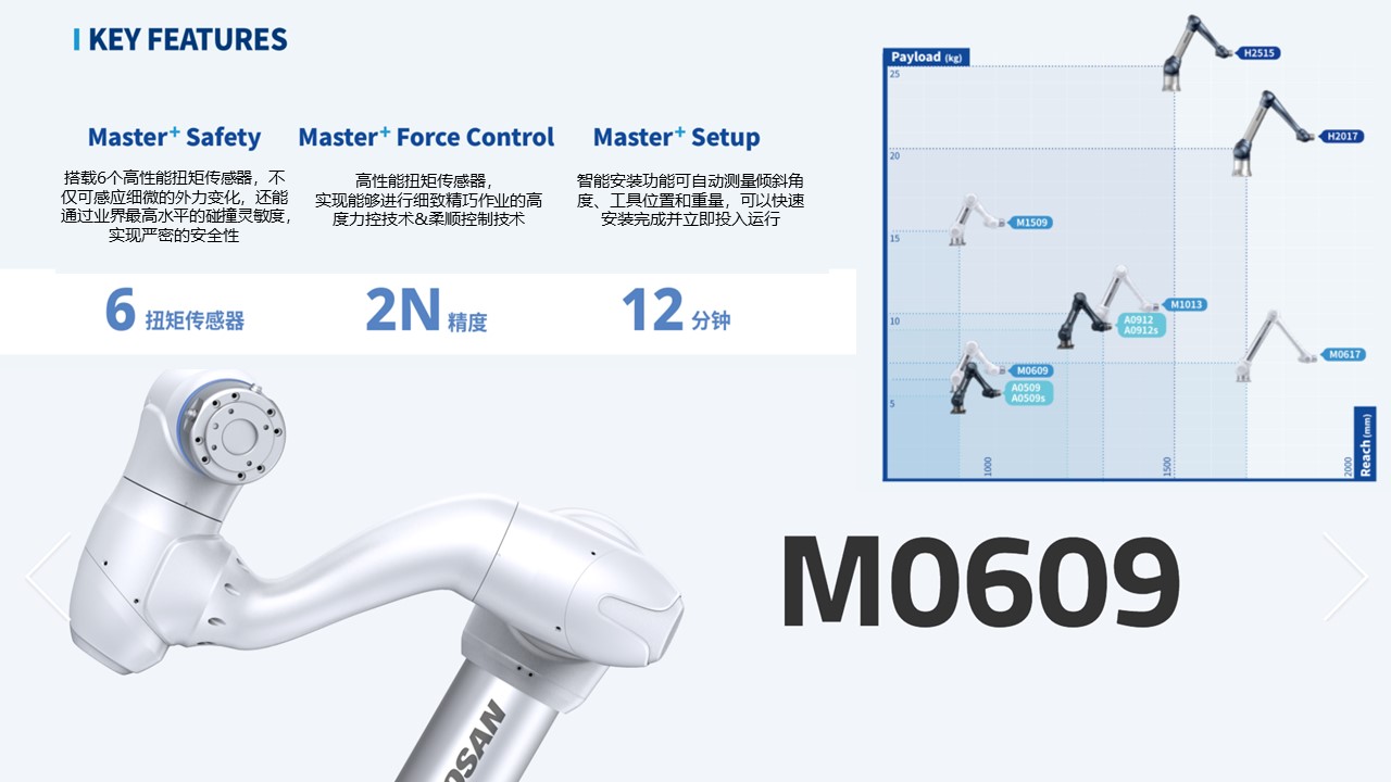 BFT机器人一站式机器人工业互联网平台提供的斗山M0609协作机器人的有效载荷为6kg,可达范围为900mm,重复精度为0.03mm,搭载6个高性能扭矩传感器,高性能扭矩传感器 实现能够进行细致精巧作业的柔顺控制技术。