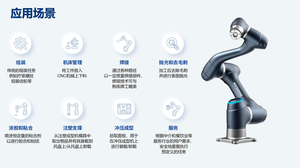 BFT机器人一站式机器人工业互联网平台提供的斗山机器人A0509/A0509s协作机器人的有效载荷为25kg,可达范围为1500mm,重复精度为0.03mm,6个高性能扭矩传感器实现业界最佳碰撞灵敏度,支持拖拽示教。