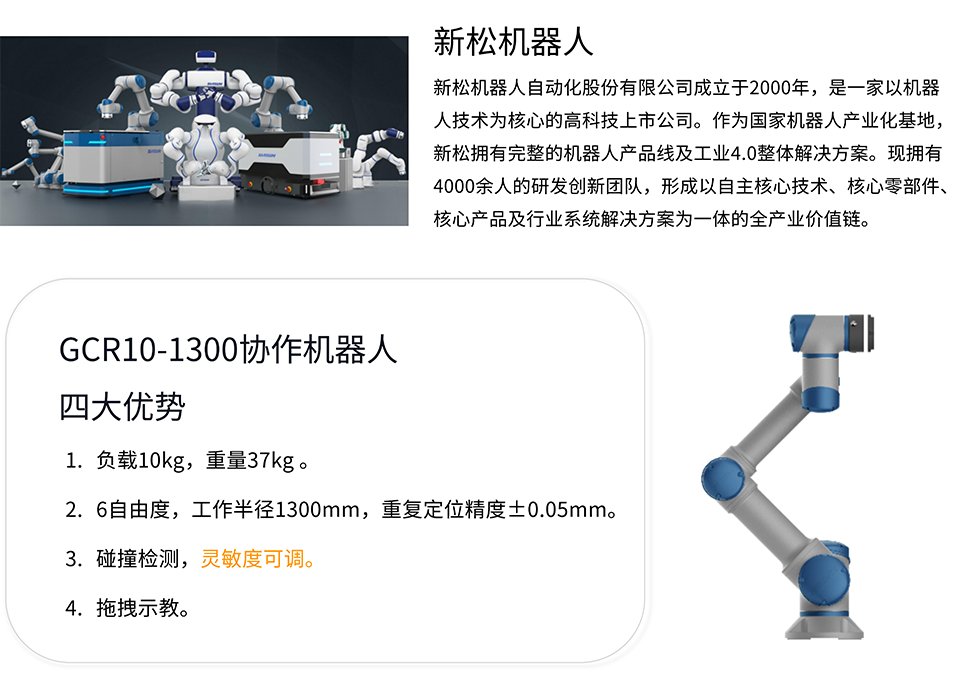 BFT机器人一站式机器人工业互联网平台提供的新松GCR10-1300机器人的额定负载10公斤,工作半径1300毫米,高性价比的全新通用型协作机器人,具有轻量级、快速部署、操作简易、安全、节能等显著特点 是实现工厂高效低成本运作的理想选择,产品重量轻,占地小,适合3C,汽车等行业。
